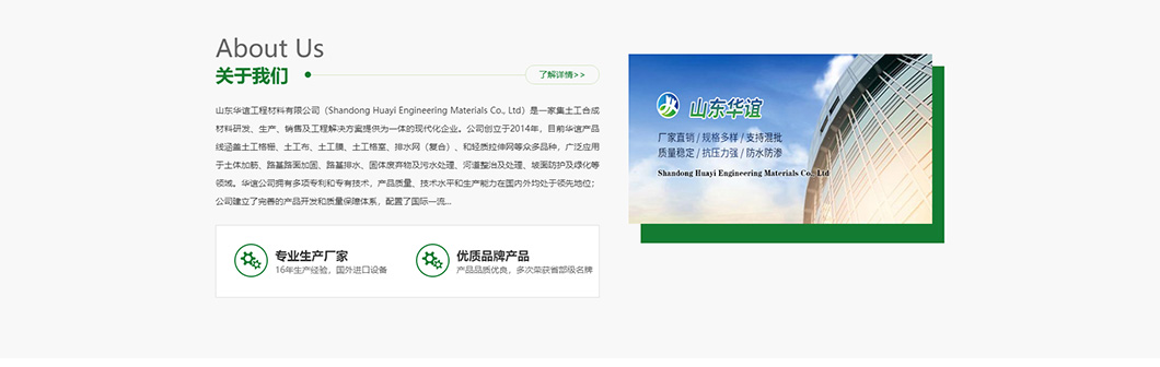 山東華誼工程材料有限公司(Shandong Huayi Engineering Materials Co., Ltd)是一家集土工合成材料研發(fā)、生產(chǎn)、銷售及工程解決方案提供為一體的現(xiàn)代化企業(yè)。公司創(chuàng)立于2014年,目前華誼產(chǎn)品線涵蓋土工格柵、土工布、土工膜、土工格室、排水網(wǎng)(復(fù)合)、和輕質(zhì)拉伸網(wǎng)等眾多品種,廣泛應(yīng)用于土體加筋、路基路面加固、路基排水、固體廢棄物及污水處理、河道整治及處理、坡面防護(hù)及綠化等領(lǐng)域。